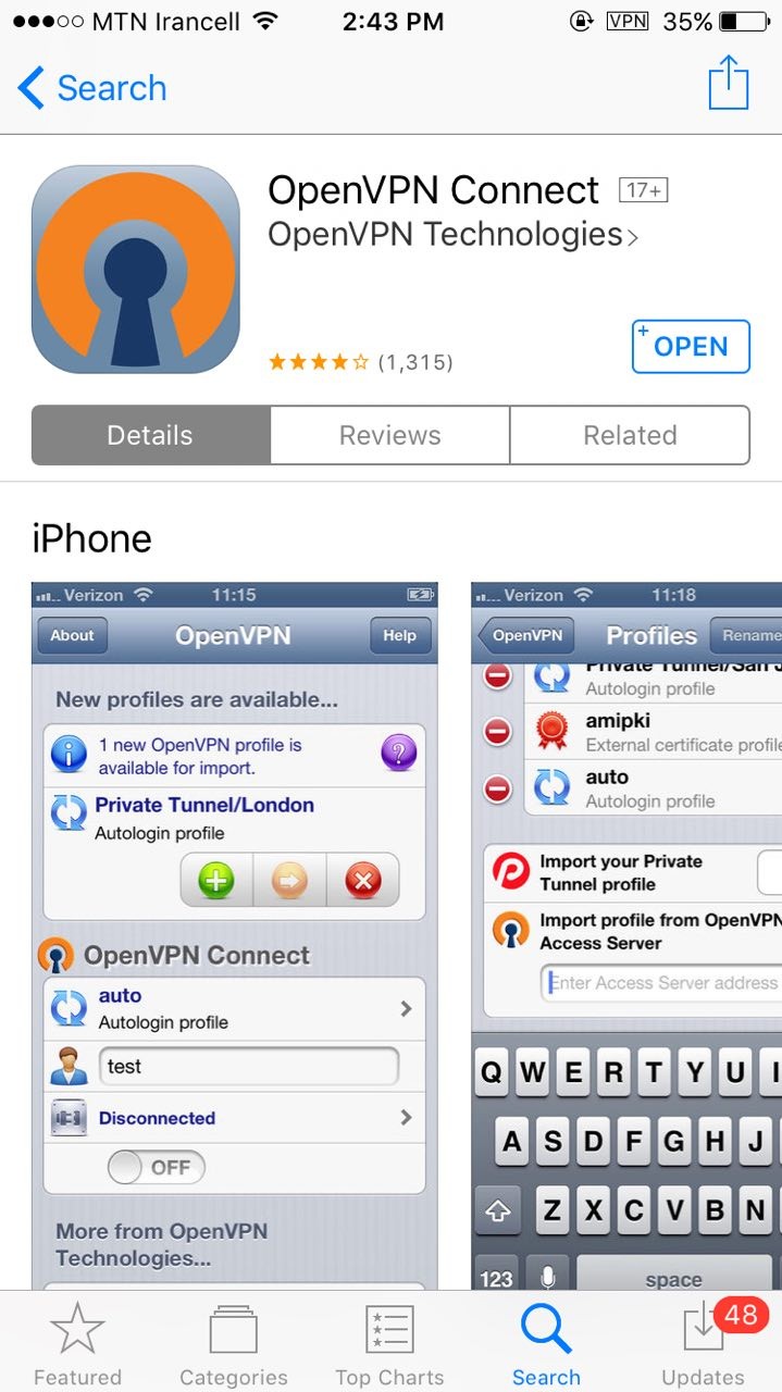 ابتدا نرم افزار openvpn را در اپ استور سرچ و سپس نصب کنید (لینک دانلود در اپ استور) :