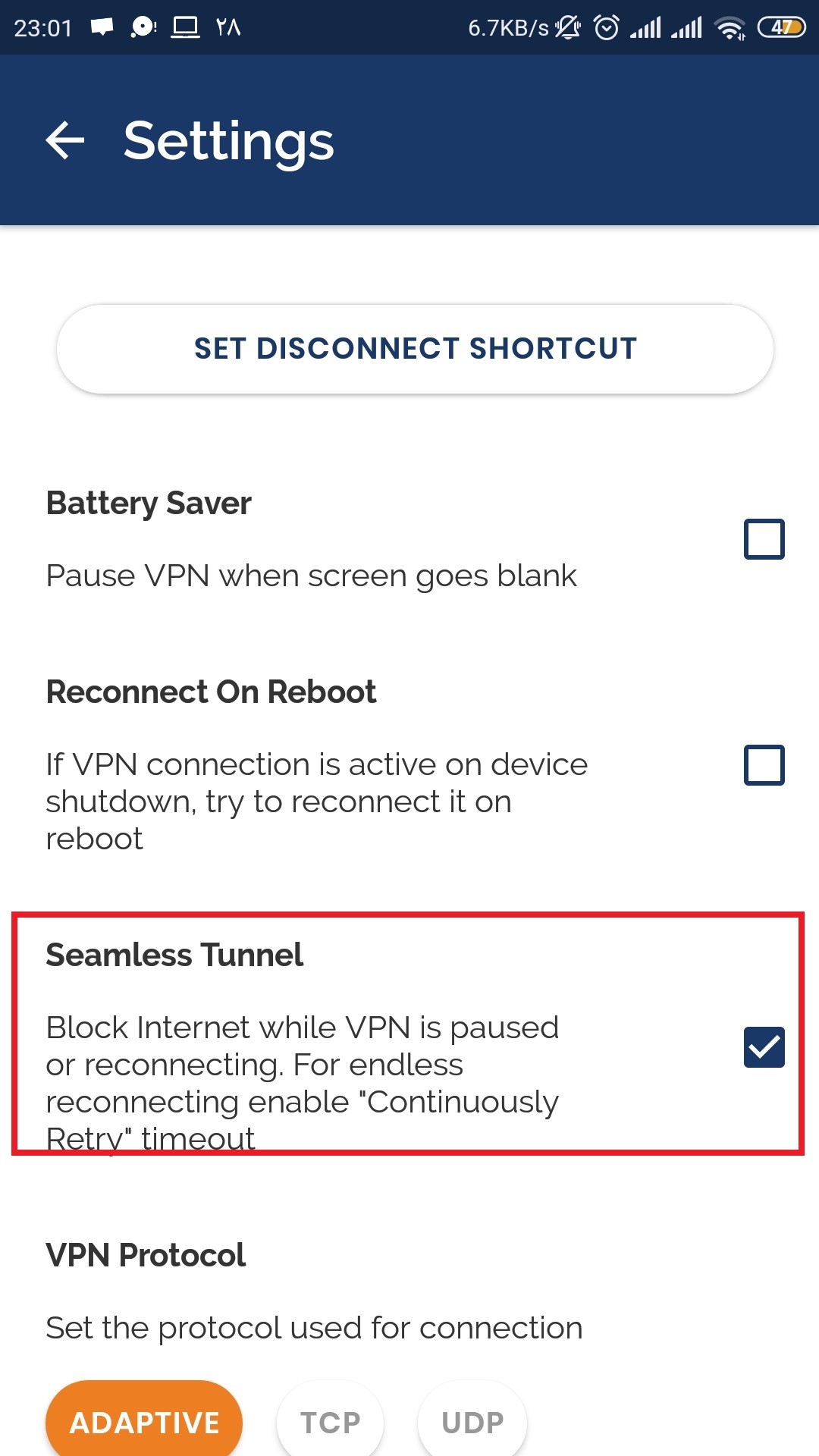 3 – حالا تیک گزینه Seamless Tuunel را فعال کنید تا امکان Kill switch برنامه فعال شود.