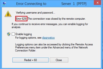 Error 809 : این خطا غالبا به دلیل مسدود بودن پروتوکل L2TP بر روی شبکه ISP شما می باشد.